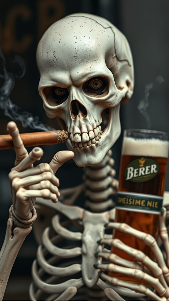 A high-definition, ultra-high-definition image of a skeleton with human-like hands and skin, smoking a cigar while looking directly at the viewer, pointing with one hand, and holding a beer in the other. The scene features intentional imperfections: deformed iris and pupils, cross-eyed gaze, cloned facial features, additional fingers, and mutated hands. The image is cropped and appears low-resolution with noticeable jpeg artifacts, text remnants, and a faint watermark. The skeleton has a long neck and some elements are out of frame, creating an intriguing and unsettling composition.