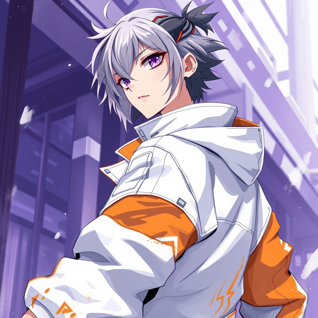 A high-detail anime character, sporting a futuristic white and orange jacket, blends into a cyberpunk setting, where shades of dark white and light violet interplay. This piece showcases precise brushwork and hints of automatism, capturing lucid developments within its subjects. Official art style presents vivid imagery and inventive intricacies, enhanced by subtle creative modifications, while maintaining the core essence intact.