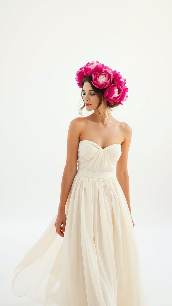 A high-detail photograph of a woman wearing a flowing dress, her head gracefully adorned with a bouquet of vibrant pink peonies, set within a stark, minimalist white room devoid of any furnishings, the simplicity of the background accentuating the vivid floral crown, while soft, diffused lighting creates gentle shadows and highlights the intricate textures and colors of the peonies.
