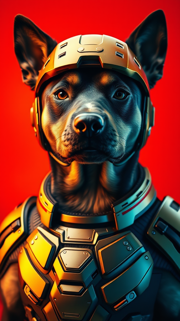 A high-detail, ultra-realistic 8k image of a dog's portrait in an alert pose, featuring a cyberpunk style with a bionic helmet. The dog is wearing armor inspired by Iron Man, adorned with golden plates and chrome accents. The image captures a vibrant contrast of bright red and yellow backlighting. The scene highlights the dog's features with incredible detail, featuring a photorealistic rendering. The design conveys a futuristic aesthetic while retaining the essence of a noble and loyal canine presence. The focus is on clarity and composition, ensuring a vivid and captivating portrayal. Avoid visual clutter and maintain a clean, precise representation of the dog in this futuristic setting.