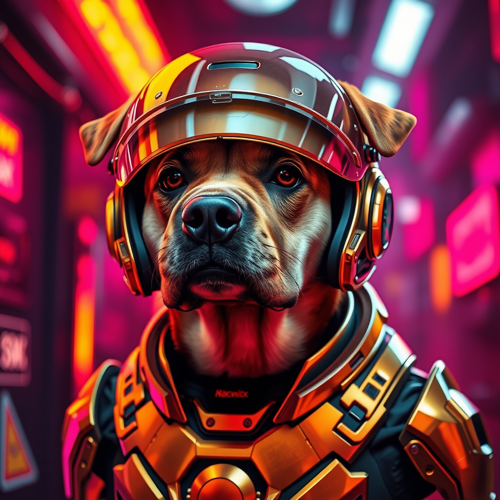 A high-detail, ultra-realistic portrait of a dog in a cyberpunk style, featuring an alert pose. The dog is wearing a bionic helmet and Iron Man-inspired armor, characterized by golden hues with chrome plating. The scene is illuminated with bright red and yellow contrasting lights. Rendered in 8k with octane-level detail, the image captures the essence of a futuristic, technologically enhanced canine. The background is stylized with elements of a vibrant, neon-lit cyberpunk world, adding depth and atmosphere without detracting from the central focus on the dog.