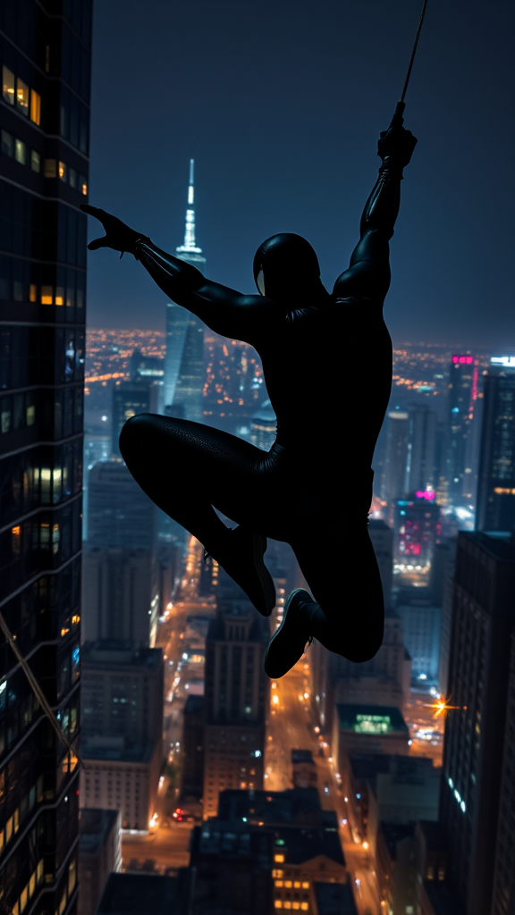 A high-detailed, super realistic Spiderman in his sleek black suit, dramatically silhouetted against the sprawling metropolis at night, effortlessly clinging to a towering building with one powerful hand. Bright city lights and towering skyscrapers cast a luminous glow over the urban landscape, enhancing the dark shadows and mysterious alleys below. Capture this stunning scene using a Canon EOS R5 with a Canon RF 24-70mm f/2.8L lens. Set the ISO to 200, use an aperture of f/2.8, and a shutter speed of 15 seconds. Utilize auto white balance to adapt to varying light conditions. Mount the camera on a Manfrotto MT055CXPRO4 tripod and trigger the shot with a Canon BR-E1 remote shutter release. Experiment with low-angle shots and creative framing to emphasize Spiderman's silhouette amid the vibrant cityscape, adding dynamic elements to the composition while maintaining the core essence of the concept.
