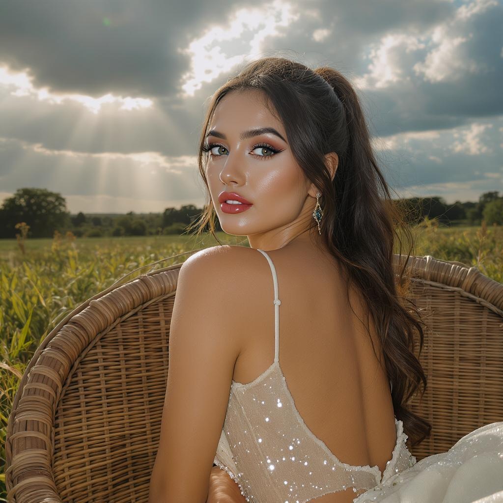 A high dynamic range photo capturing a stunning woman with long, dark-brunette hair and light-blue eyes. Her fair complexion and full lips are highlighted as her hair is pulled back into a ponytail. She is elegantly dressed in a sleeveless, sequined gown and is gracefully seated in a wicker chair, leaning slightly to one side. The scene is set outdoors in a picturesque field on a partly cloudy day, with the sun piercing through the clouds and creating dramatic god rays. The image features vivid colors and rich details, showcasing clear shadows and highlights with intense contrast, all contributing to a realistic portrait of distinctive beauty. There are hints of creativity and unique elements subtly integrated into the scene, such as a delicate touch of jewelry and a striking sense of realism and clarity.