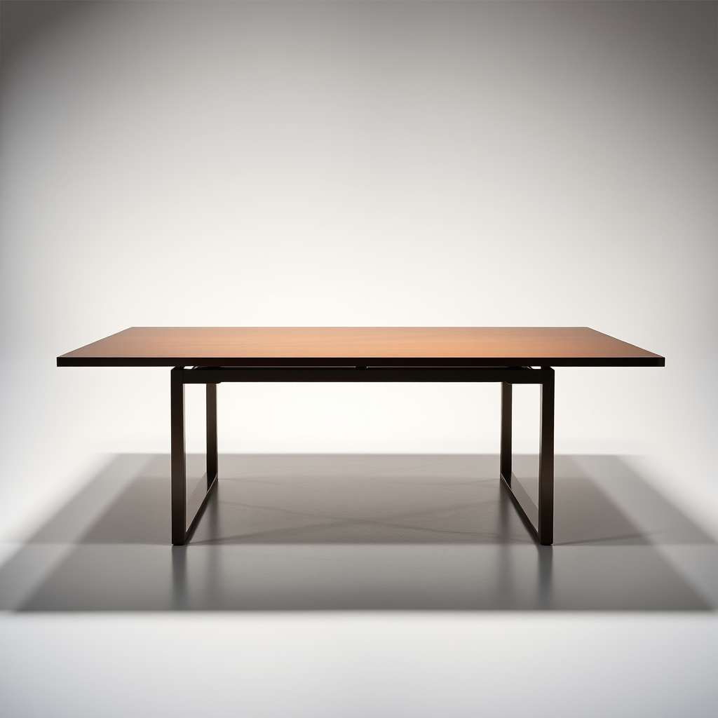 A high-end USM Haller Table captured in a sophisticated photo studio using a Fujifilm GFX 100S and a GF 80mm f/1.7 lens, showcasing the table's minimalist design and polished finish in a setting that highlights its sleek form. Subtle ambient lighting accentuates the table's contours and craftsmanship, emphasizing its modern elegance.