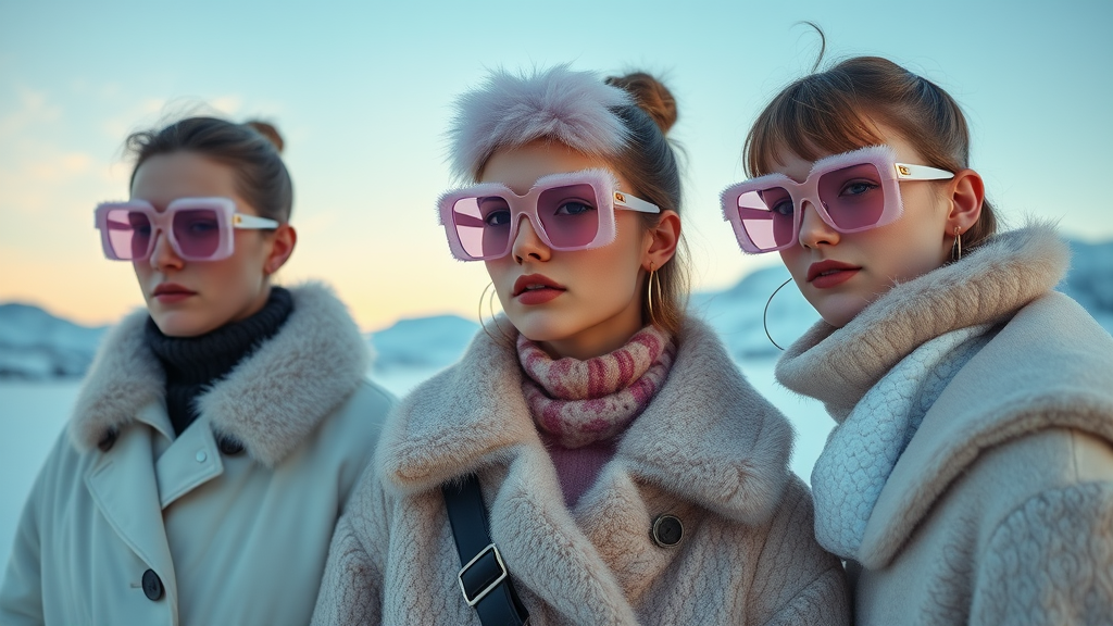 A high-fashion editorial shoot featuring a Jacquemus and Moncler collaboration; showcasing light pink semi-transparent fur-trimmed sunglasses, captured in hyper-realistic detail with 8k clarity; the setting is a dreamlike winter landscape, where the soft pastel hues of a snowy sunrise illuminate the scene; models are styled in avant-garde ensembles blending chic Parisian design with alpine flair, with intricate textures and layers, bringing an artistic touch to the hyper-realistic aesthetic.
