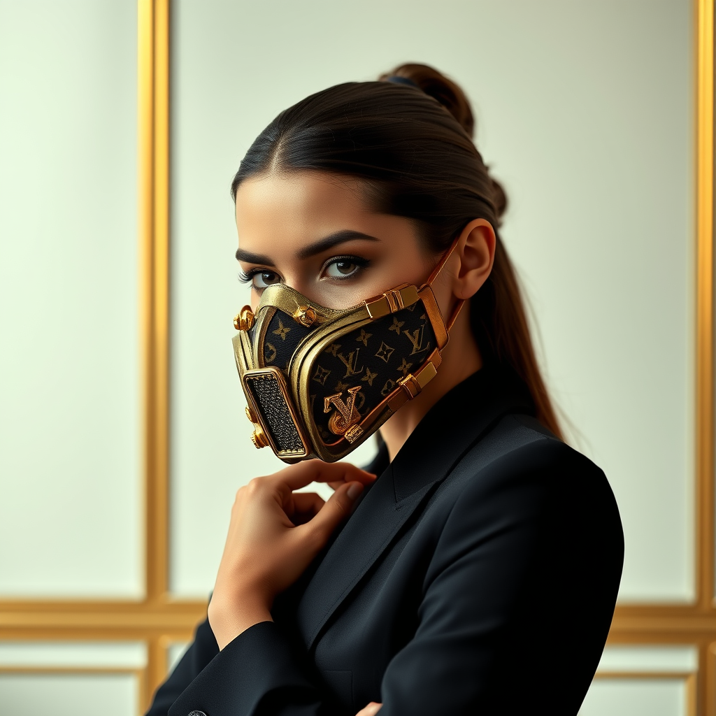 A high-fashion Louis Vuitton luxury face mask inspired by the iconic Facehugger from the movie Aliens, expertly crafted with signature LV monogram patterns, featuring intricate gold embellishments and sleek leather straps. Capture this avant-garde piece in a professional advert photo shoot, emphasizing the sumptuous textures and elegance of the mask, worn by a sophisticated model exuding poise and confidence. Set against a minimalist, opulent backdrop that highlights the striking fusion of high fashion and science fiction, with soft, dramatic lighting to enhance the allure and exclusivity of the design.
