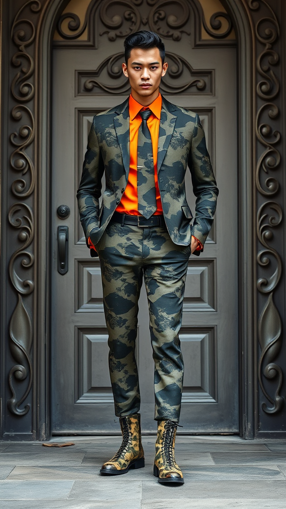 A high-fashion magazine cover features a full-body shot of a male model standing confidently in front of a stylish, intricately designed door. He's wearing a chic camouflage patterned suit that blends contemporary style with military-inspired flair. His bright orange shirt adds a bold pop of color, contrasted against a camouflage tie that ties the outfit together. The look is completed with uniquely textured camouflage boots, adding an edgy yet sophisticated touch. The model's pose and the ensemble create a striking visual, capturing the essence of modern urban fashion with a playful twist on classic elements.