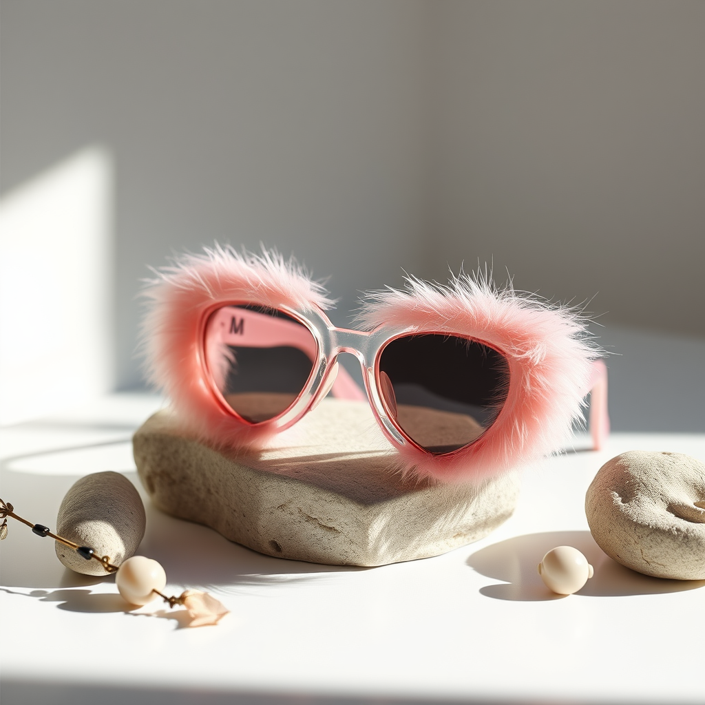 A high-fashion photoshoot featuring a Jacquemus and Moncler collaboration with luxurious light pink translucent fur sunglasses. The scene is captured in hyper-realistic detail, showcasing an 8k quality image. The setting combines both fashion and art, with the sunglasses as the focal point surrounded by minimalist elements. The ambiance exudes elegance and high fashion, emphasizing the delicate fur texture and unique translucent design. The image is expertly balanced with subtle lighting and shadow play, evoking an aura of modern sophistication and artistic flair.
