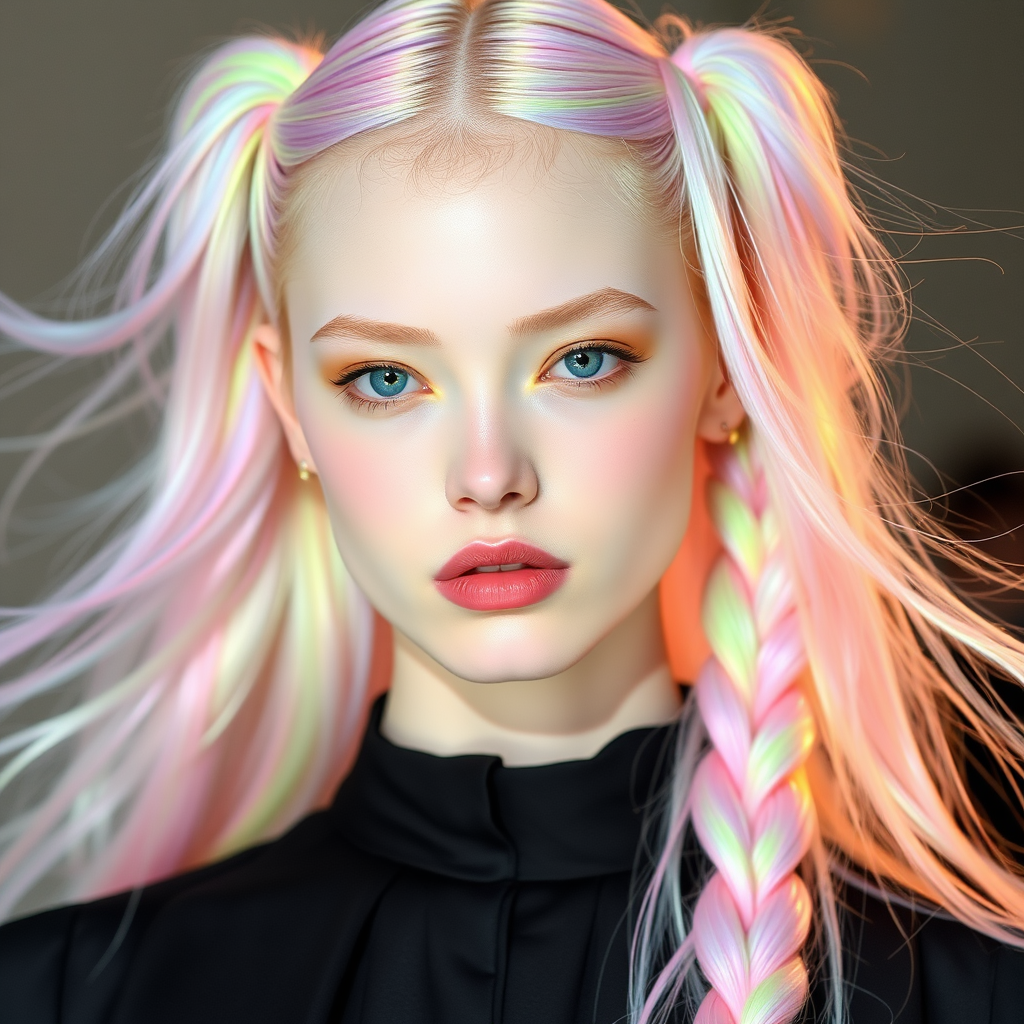 A high-fashion runway model with flowing, vibrant candycore-inspired long pigtails, with iridescent pastel hues cascading down her hair. Her complexion is strikingly pale, accentuating the delicate, light pink tint of her lips. The look is ethereal and otherworldly, blending avant-garde couture with a playful, sugary aesthetic, capturing the essence of a fantastical, candy-themed wonderland.