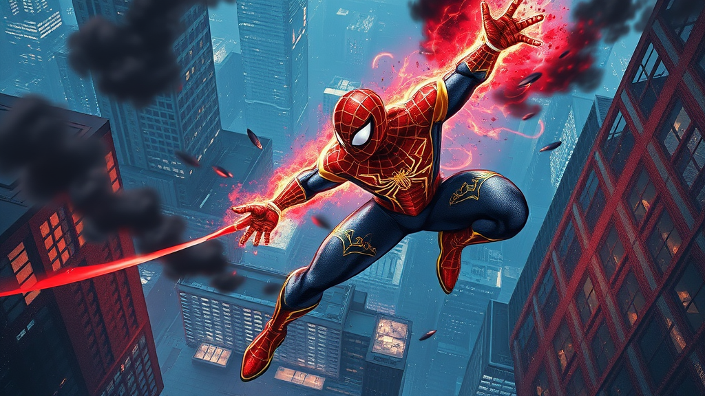 A high ground angle shot captures the scene of skyscrapers dwarfed below as Spiderman engages in an epic battle, his body adorned with glowing golden runes, surrounded by a vibrant red and blue aura. Caught in an intense dynamic action pose, his detailed anime-style design reveals intricate body markings. His full body GALAXY armor glimmers with interstellar hues, sending plumes of jet-black smoke swirling around him. The image, inspired by Prokoko, is brought to life with bold, expressive brushstrokes and vivid colors, enriched by a china ink effect. The scene is infused with the CarnageStyle modifier, featuring an intense blood-red color, and set within dramatic cinematic lighting. The dynamic angle enhances extreme details, capturing the fury and energy of Spiderman's battle, making small creative adjustments while staying true to the core concept.