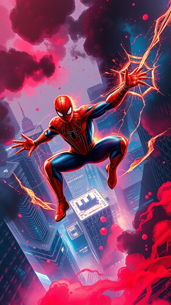 A high ground angle shot reveals skyscrapers on low ground with Spiderman engaged in an epic battle, enshrouded in a red and blue aura. His body, dynamic in an action-packed pose, is adorned with glowing golden runes. The character design echoes a detailed anime style with FW Murano influences, amplified by a full body GALAXY armor. Wisps of jet black smoke swirl around the scene as vivid colors burst forth, enhanced by Prokoko's signature bold, expressive brushstrokes. The backdrop resonates with a cinematic lighting effect, while a China ink effect adds depth and drama. The piece is further intensified by the CarnageStyle modifier, infusing the scene with blood-red hues. The angle is dynamic and the details extremely meticulous, creating an immersive, high-intensity visual narrative.