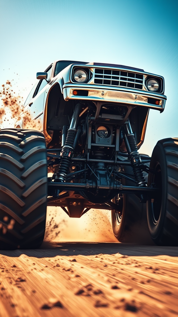 A high-octane photograph capturing a monster truck in full throttle, kicking up dirt as it barrels directly towards the camera, showcasing its immense power and speed. The dynamic range is expertly managed to highlight the intense contrasts between the dark tires and the sunlit, metallic body of the truck. The scene is filled with dynamic motion, capturing the thrill and adrenaline of sports shooting, as the background blurs into a whirlwind of motion, emphasizing the unstoppable force of the monster truck's charge.