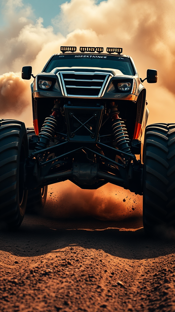 A high-octane photograph capturing the adrenaline-fueled intensity of a monster truck thundering directly toward the camera, dust billowing in its wake. The dynamic range expertly highlights the interplay of light and shadow on the vehicle's massive wheels and rugged frame, conveying a sense of unstoppable power and motion. The image freezes a dramatic moment in time, pulling the viewer into the heart-pounding excitement of extreme sports action.
