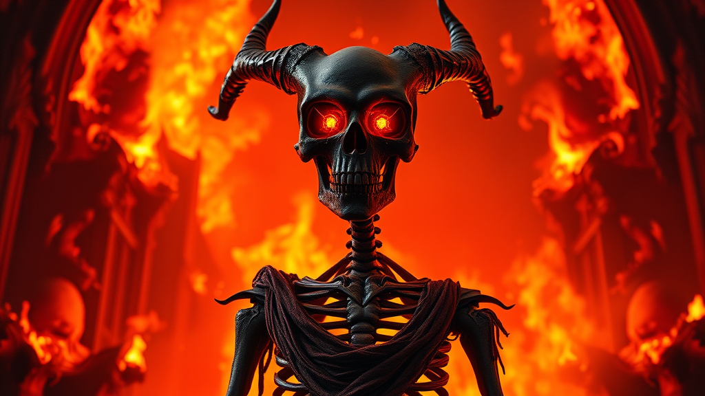 A high-quality 3D portrait rendering of a Ghoul standing vigil at the infernal gates, its form both sinister and captivating. The ghoul's skull blazes with an unholy fire, casting a fierce glow through its intense, glistening red eyes. Its slender, towering figure is draped in tattered rags, barely concealing a highly intricate skeletal frame. Surrounding it, the background roars with vivid, detailed flames, illuminating the scene with an ominous, fiery glow. Steeped in dark fantasy horror, the atmosphere is enriched by dramatic, cinematic lighting, creating a hauntingly beautiful visual. The perspective is artful and slightly soft-focus, shot with an f/2.2 depth of field for a dreamlike effect. The ghoul's visage remains free of horns, eyes, nose, hair, and text, allowing the pure essence of dread to emerge from this evocative scene.