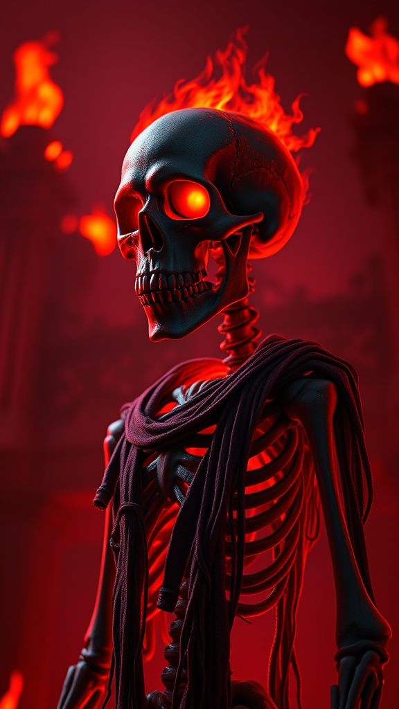 A high-quality 3D portrait rendering of a ghoul standing vigilant at the gates of Hell. The skull burns with an infernal glow, with eyes that smolder a radiant crimson. Its tall, slender frame is a mesmerizing display of intricate skeletal detail, draped in tattered rags that hint at a long, forgotten past. In the background, intensely detailed flames dance and flicker, casting an ominous, fiery glow. The scene is steeped in the dark fantasy horror genre, illuminated by dramatic and cinematic red lighting. The atmosphere is one of chilling intensity, with a soft-focus effect that adds an ethereal quality to the ghoul's presence. The depth of field and aperture create a hauntingly vivid vision with artful composition elements reminiscent of works showcased on ArtStation.