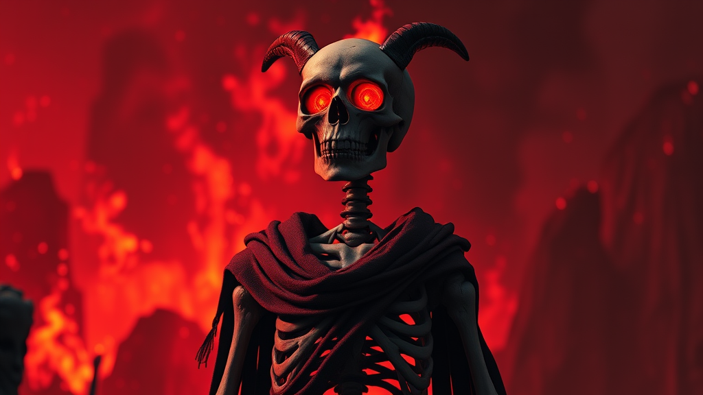 A high-quality 3D portrait rendering of a ghoul standing as the sentinel of Hell's gates, featuring a burning skull with intense, flickering red eyes. Its slender, towering body showcases an intricately detailed skeleton draped in tattered, shadowy rags. The background is engulfed in an inferno of highly detailed flames, exuding a dark fantasy horror ambiance with rich red, dramatic, and cinematic lighting. The atmosphere is reminiscent of an artstation masterpiece, with a soft-focus effect that enhances the depth of field, capturing an eerie, otherworldly essence. The ghoul's face is devoid of horns, eyes, nose, and hair, adding to its ghostly, skeletal appearance.