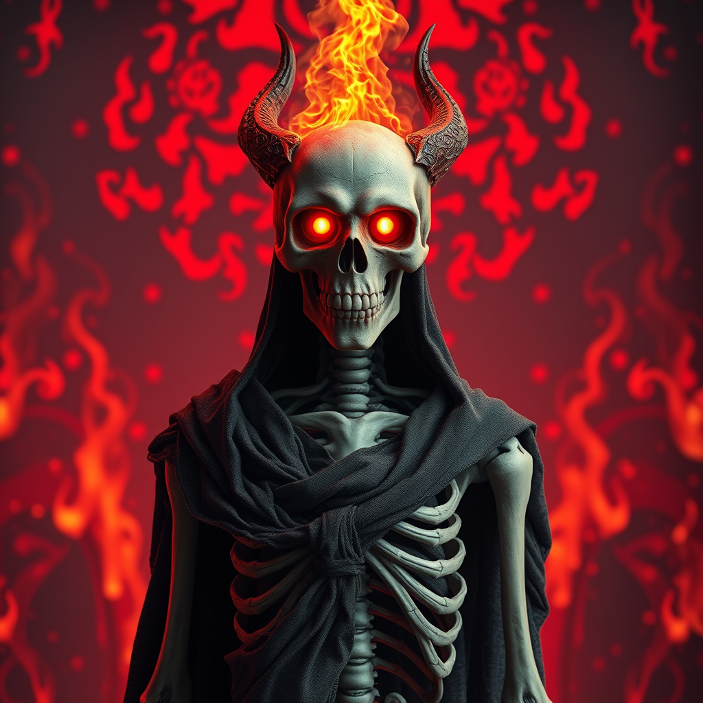 A high-quality 3D portrait rendering of a ghoul stationed as the guardian of Hell's gates, featuring a burning infernal skull with glowing red eyes. The figure has a slender, towering physique, showcasing a meticulously detailed skeleton draped in tattered rags. The background is engulfed in intricately designed flames and fire, capturing a dark fantasy horror atmosphere with dramatic, cinematic red lighting. The scene is reminiscent of an artstation masterpiece, employing soft-focus techniques and shot with a wide aperture for depth of field. The composition emphasizes the eerie and haunting presence of the ghoul without the need for additional appendages or text elements.