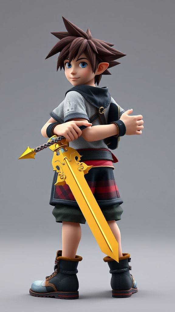 A high-quality 3D rendering of Sora from Kingdom Hearts in a full body pose, wearing his iconic adventurous outfit and a backpack featuring a silver crown emblem. He is motion-standing, confidently holding his well-known golden bioluminescent Keyblade, set in a photoshoot studio backdrop. The scene is created in 3D Studio Max and rendered in V-Ray, showcasing professional and award-winning quality. Inspired by the work of Stanley Artgerm Lau, the rendering uses realistic materials and accurate dimensions. The character maintains excellent proportions and a natural posture, ensuring a highly detailed and accurate representation, free from imperfections such as facial or body distortions, extra limbs or fingers, and maintaining an overall clear and defined appearance.