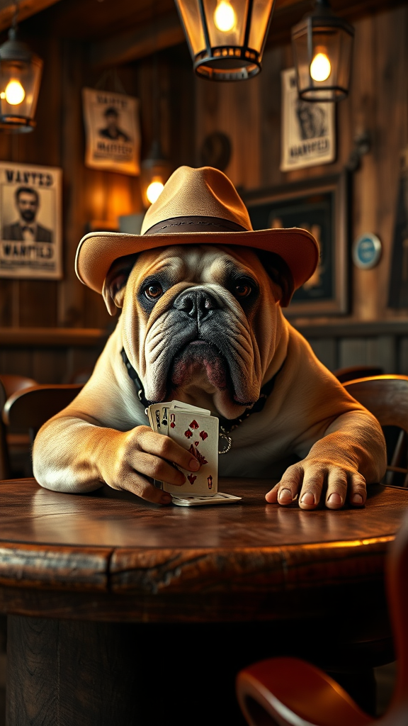 A high-quality, 8k ultra-high-definition RAW photo of an English bulldog deeply engrossed in a poker game inside a classic Western saloon. The bulldog, wearing a small, well-fitted cowboy hat, sits confidently at an old wooden poker table with a slightly tilted revolver holstered at its side. Its intense gaze focused on the cards in its paw, showcasing a blend of determination and mischief. The saloon's ambiance is rich with rustic details, like weathered wooden walls adorned with vintage wanted posters and dimly-lit lanterns casting warm, inviting glows over the scene. The image is captured with a Fujifilm XT3 DSLR, ensuring impeccable clarity and texture, bringing out the dog's wrinkled features and the grain of the wooden surroundings, encapsulating the essence of the Wild West poker experience with a playful twist.