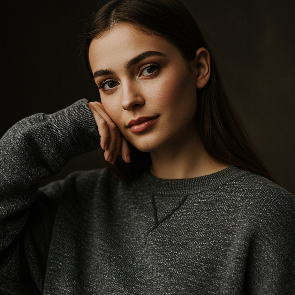 A high-quality, analog-style close-up photograph of a young woman wearing a textured film grain sweatshirt, captured in 8k UHD resolution with a DSLR camera, showcasing ultra-detailed facial features and intricate fabric details, conveying an essence of authenticity and warmth. Her expression is serene and contemplative, adding depth to the masterpiece shot, reminiscent of a vintage film portrait.