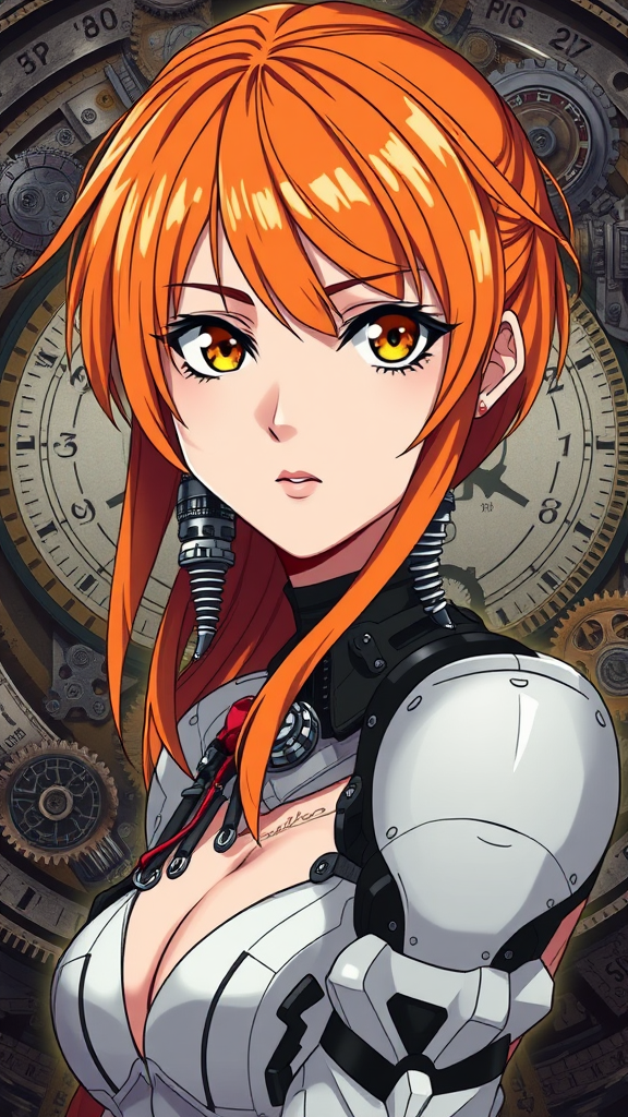 A high-quality, centered, 2D illustration in an anime style featuring a female character with expressive eyes and a perfect face. She is depicted in a dynamic full-body pose, suitable for sharing on social media. The theme combines elements of clockwork, robotics, and cybernetic enhancements with a touch of biochemical steampunk. Her striking orange hair contrasts against a backdrop filled with intricate gears and mechanical details. The composition is inspired by "Ghost in the Shell" and includes professional-level artistry, with soft shadows and volumetric lighting enhancing the scene's depth.