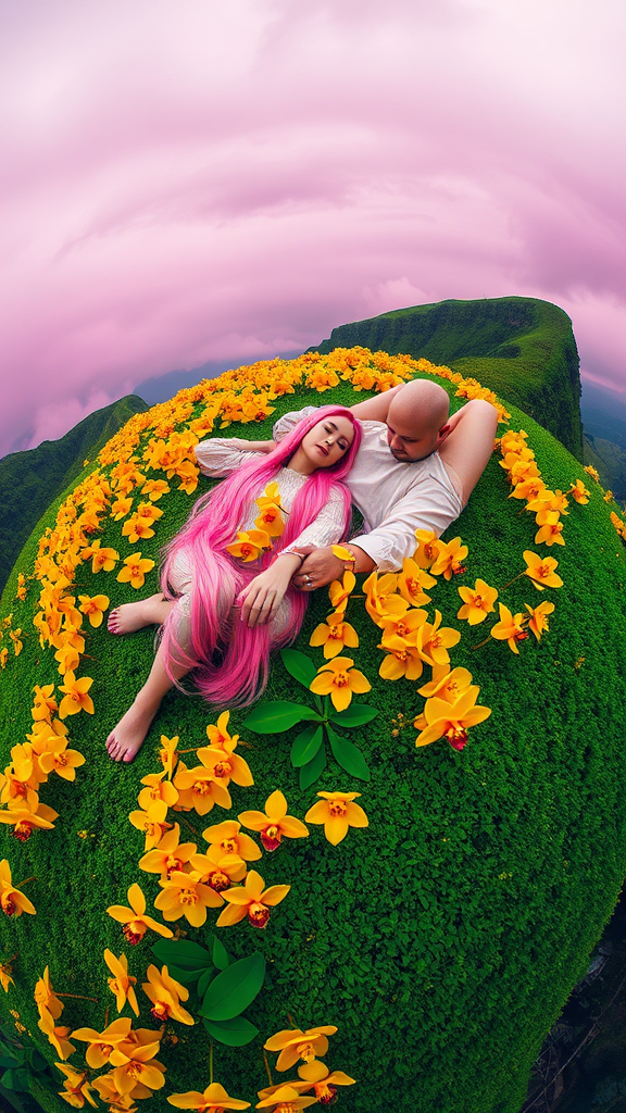 A high-quality creative fashion image captured with a Hasselblad camera, set at 200 ISO and f/11. Featuring an ultra-realistic scene of a girl with long pink hair lying next to a man with no hair atop a lush, green mountain covered in vibrant, acid yellow orchids. The image is shot using a Sigma 15mm fisheye lens, ensuring sharp focus and bright light. The scene is bathed in striking acid pink hues, creating a vivid and surreal atmosphere. The DSLR captures the essence with a surreal landscape that blends fashion and nature seamlessly. Aspect ratio 2:3.