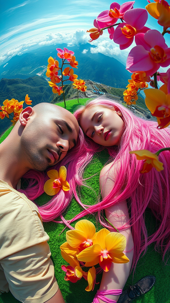 A high quality creative fashion image featuring an ultra-realistic scene captured with a Hasselblad camera, set at 200 ISO, f/11, using a Sigma 15mm fisheye lens. The image portrays a girl with ultra-realistic skin and long, flowing pink hair, laying down beside a man with a shaved head. The setting is atop a vibrant green mountain adorned with striking acid-yellow orchids. The focus is razor-sharp, with bright, vivid lighting casting an ethereal glow over the scene. The color palette highlights bold acid pink tones, creating a captivating visual contrast. The image is in DSLR quality, with an aspect ratio of 2:3, capturing the essence of an imaginative high-fashion editorial.