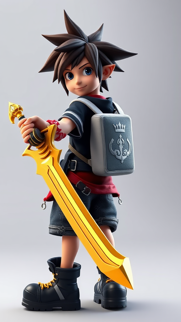A high-quality, detailed 3D rendering of the iconic character Sora from Kingdom Hearts, captured in a full-body pose. Sora is depicted wearing his signature adventurous attire, complete with a backpack featuring a silver crown emblem. He is motion-standing, confidently gripping his famous golden bioluminescent keyblade. The backdrop is a professional photoshoot studio, designed meticulously with precise dimensions and realistic materials. The rendering aims for a polished and award-winning appearance reminiscent of Stanley Artgerm Lau's style, showcasing Sora in a dynamic yet natural stance. The visual excludes any low-quality elements such as text logos, watermarks, or poorly defined anatomy, avoiding unrealistic or impossible body positions and keeping the focus sharp and true to the character's essence.