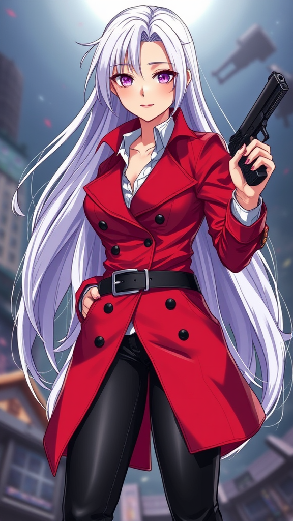 A high-quality digital art depicting a full body anime-style female character set in a fantasy world. She has long white hair flowing elegantly and clear, striking purple eyes that enhance her flawless face. She wears a stylish red trench coat over a crisp white shirt, paired with sleek black pants and matching black boots. A black belt cinches her waist. In her right hand, she confidently holds a pistol. Her eyes are perfectly shaped, complementing her cute face adorned with enticing red lips and a seductive expression. The artwork is highly detailed, with careful attention to skin texture and clothing fabric, capturing the essence of an alluring and powerful figure in vibrant, sharp colors.