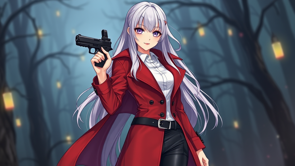A high-quality, high-resolution digital art piece depicting a full-body anime-style female character set in a fantasy world. She has mesmerizing long white hair and captivating clear purple eyes. Her face is flawless, with perfect eyes and an adorable expression, accentuated by red lips and a seductive gaze. She dons a striking red trench coat over a crisp white shirt, paired with sleek black pants, stylish black boots, and a chic black belt. In her right hand, she confidently wields a pistol. The artwork captures her elegance and allure while embracing subtle creative enhancements to her appearance and attire.