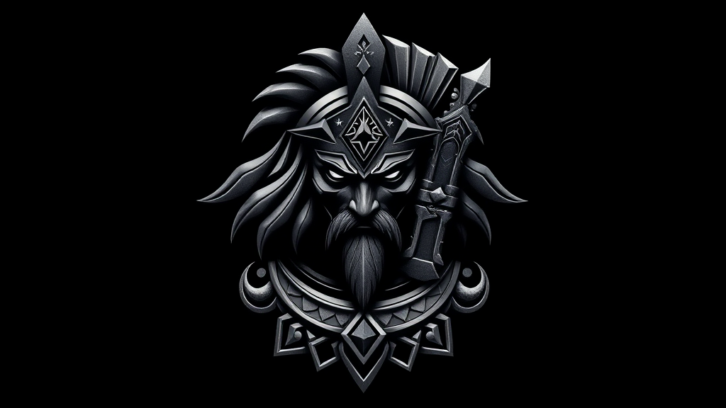 A high quality logo featuring a warrior with intricate detailing, crafted in black metal. The design exhibits geometric patterns and perfect symmetry, embodying realism through advanced ray tracing techniques. Rendered in black and white, this logo is a vector masterpiece, capturing lifelike qualities with an 8k resolution, embodying strength and elegance without the inclusion of the letter V.