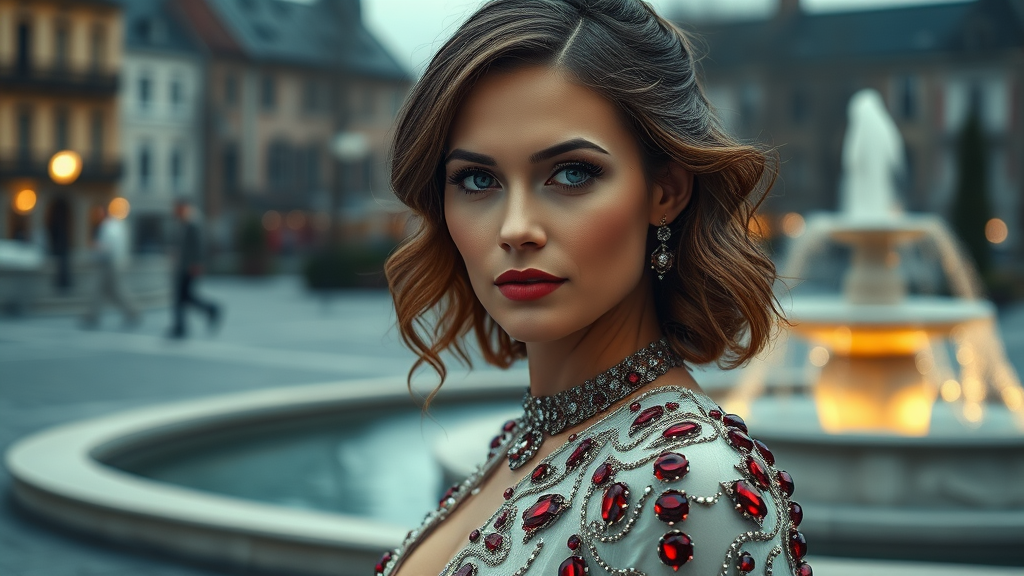 A high-quality portrait captures an active woman with striking presence, her gaze meeting the camera with confidence. She's elegantly dressed in a bespoke haute couture gown adorned with rubies, each bead meticulously embedded into the fabric. The setting is a picturesque town square with a fountain softly blurred in the distant background, suggesting a beautiful cityscape reminiscent of Cass Bird's sophisticated lens. The composition adheres to the golden ratio, achieving a perfect sense of balance. The photo showcases photorealistic detail through exquisite ultra-realistic, hyperdetailed skin, with a soft matte texture and nuanced lighting that enhances her features. Subsurface scattering achieves a lifelike warmth, while the shadows add depth and dimension. Captured in an analog style with film grain, the image is a masterpiece in 8k UHD, exemplifying studio photography at its best.