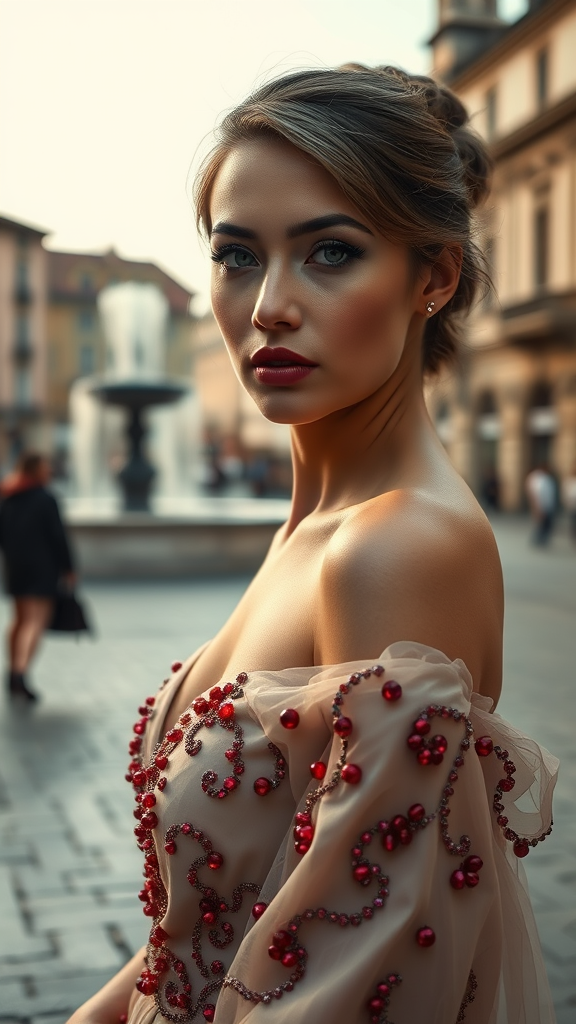 A high-quality, ultra-realistic portrait captures a woman with striking features as she gazes confidently at the camera. She is adorned in an exquisite haute couture gown, intricately embellished with ruby beads that shimmer elegantly in the cloth. The scene is set in a town square, with a distant fountain providing a picturesque backdrop in a stunning city. The composition, inspired by Cass Bird, emphasizes glamour and captures the essence of beauty through the lens of a Cinestill Hasselblad 85 mm camera. The photograph showcases a meticulous attention to detail, from the soft lighting and subtle shadows highlighting her matte skin, to the hyper-detailed and analog style reminiscent of classic film grain. This masterpiece is characterized by its photorealism, intricate, and high-quality execution, celebrating the art of portraiture. Subtle creative elements enhance the visual appeal while preserving the integrity of the core concept.