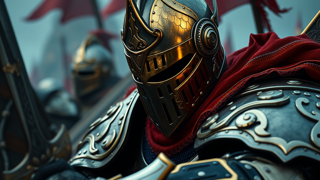 A high-ranking knight engaged in battle, stylized in Unreal Engine, adorned in dark gold and ivory armor, capturing close-up intensity with sleek metallic finishes, infused with aurorapunk flair against cinematic backdrops, exuding a dynamic presence reminiscent of furaffinity aesthetics, set within an aspect ratio of 71:63, amplified with vibrant creativity and enriched detail.