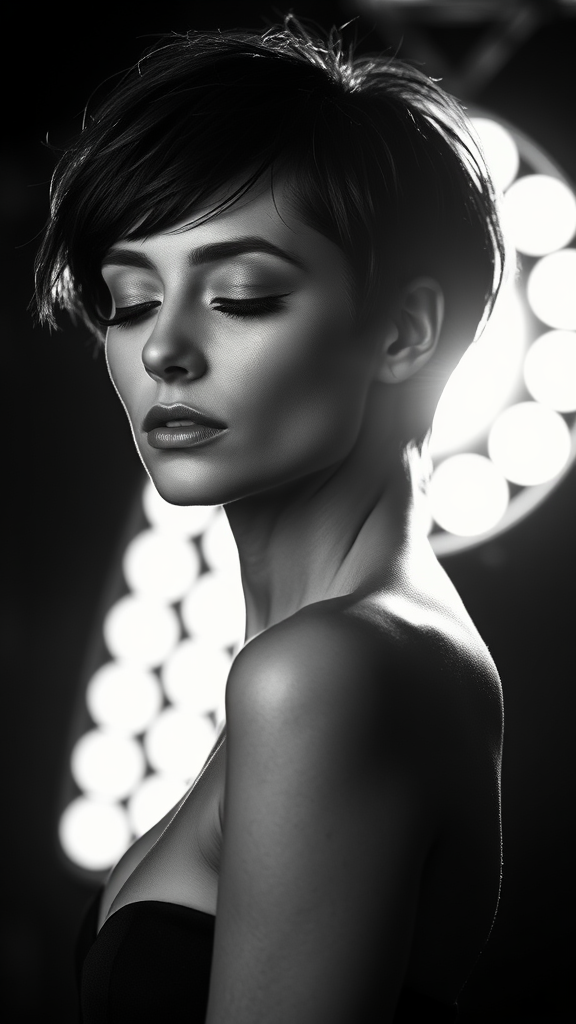 A high-resolution, cinematic black and white photograph captures a striking fashion editorial portrait of a stunning woman with short, dark hair, her eyes gently closed. The studio lights play dynamically around her, highlighting the contours of her form with a luminous backlight, evoking a sense of elegance and serene beauty. The composition reveals a balance of realism and artistry, creating a timeless visual narrative.