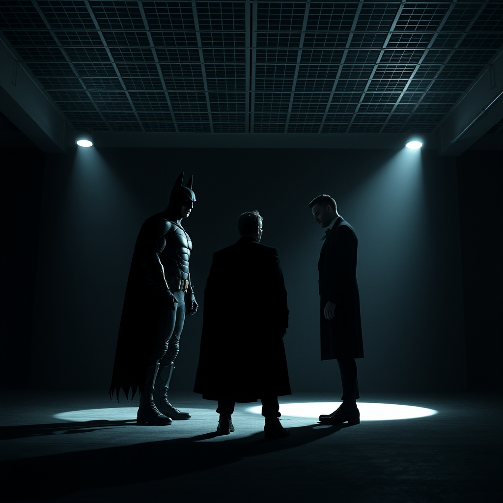 A high resolution cinematic photo captured with an arri alexa mini and carl zeiss cp-2 lens set, aperture at f/2.8 or f/4, ISO 100, shutter speed 1/20, depicting the intense black silhouettes of Batman and Joker in a meeting scene. The image is rendered in monochromatic tones, set against a dark backdrop. A minimalistic white grid system ceiling contrasts with the stark concrete flooring. Cinematic light effects create dramatic top to bottom shadows, enhancing the scene's high contrast and photorealistic appeal. Ultra detailing in 8K resolution highlights the raw and gritty atmosphere, maintaining the original vision while introducing subtle creative nuances.