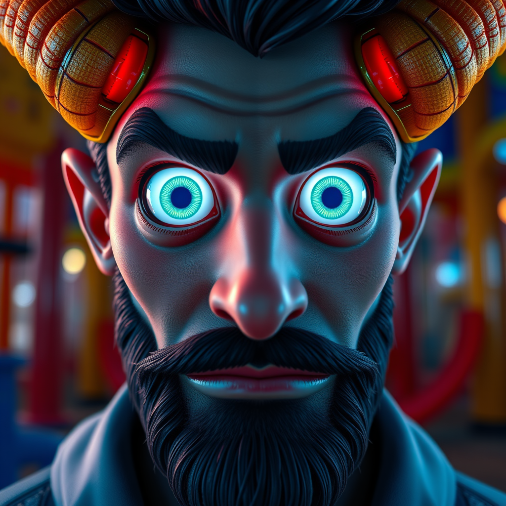A high-resolution close-up portrait of a man with prominently curved horns and a textured beard, expertly crafted by a renowned senior character artist, inspired by polycount contest winners and perfected in computer art. Rendered using Unreal Engine 5, this scene features mesmerizing, bright neon eyes characteristic of Pixar animation. The eyes appear oversized, circular, and reflective, adding a whimsical charm to the character. The rendering delivers a cinematic smooth finish, with intricate details throughout, while maintaining a slightly abstract and cartoonish feel. The character's features are exaggerated, reminiscent of a stylized, animated toy figure. The environment offers a subtle nod to a playground theme by Nomeradona, with unique and creative twists in its depiction. Despite some artistic distortions like additional limbs or disproportions, the focus remains on a playful, ethereal expression. Presented in vivid colors with occasional oversaturation, this digital piece contains subtle blurs and abstract forms that give it a contemporary art edge. The use of pencils, pen, and paper settings mixed with CGI elements enhances its artistic narrative, in a 3D frame without any logos or watermarks to distract from the artwork's charm.
