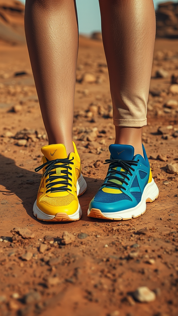 A high-resolution fashion photoshoot on the surface of Mars features models showcasing two pairs of vibrant yellow and deep blue shoes. The striking footwear stands out against the rugged Martian landscape, captured with professional precision to enhance the brand's aesthetic. The photorealistic 8k images highlight the shoes' intricate details and bold colors, blending cutting-edge fashion with an otherworldly backdrop.