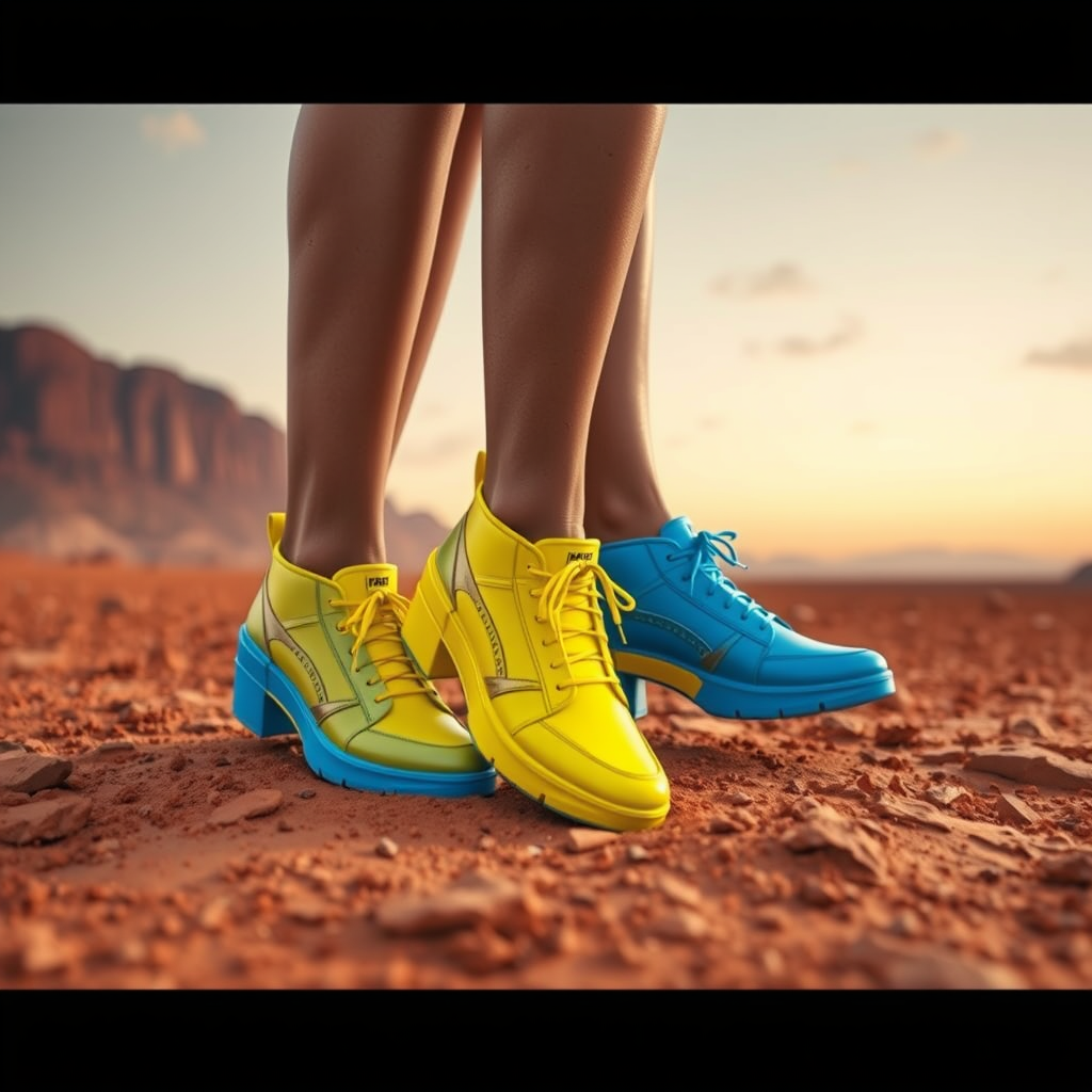 A high-resolution fashion shoot captures the essence of style on the Martian landscape. Two pairs of striking yellow and blue shoes adorn the feet of models, set against a backdrop of rust-red terrain and a dusky sky. The footwear, showcasing a renowned brand, pops vividly in the unique setting, highlighting their innovative design. The photorealistic image, rendered in 8k, immerses viewers in the scene, blending futuristic elegance with the rugged terrain of Mars, creating a breathtaking fashion moment that transcends worlds.