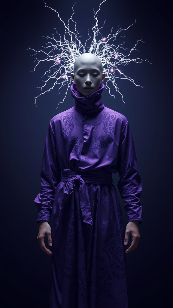 A high-resolution, front-facing figure of indeterminate gender stands with an electromagnetic aura surrounding their head, their face void of features. Clad in avant-garde purple attire that flows in intricate patterns, the figure exists within an enigmatic scene. The minimalist setting, enveloped in low-key lighting, amplifies the air of mystery, bending reality with surreal realism. Textures and details are meticulously rendered, with the electromagnetic phenomenon casting subtle illuminations, enhancing the mystical atmosphere of this creatively reimagined reality.