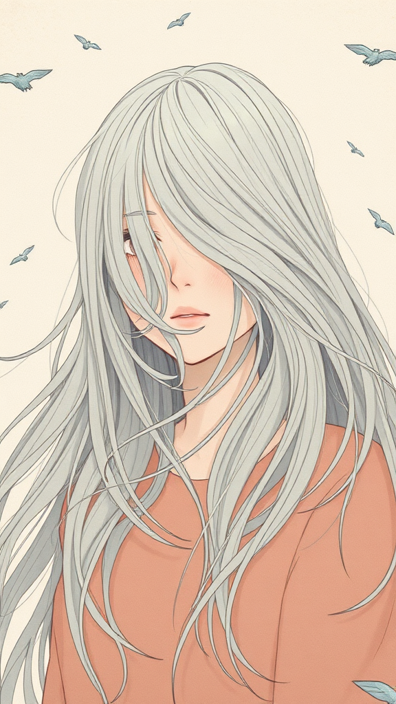 A high-resolution illustration depicting a girl with flowing long hair obscuring her face, inspired by the artistic styles of Oliver Wetter and Paul Hedley. Capturing the gentle flow reminiscent of wavy patterns and subtly incorporating the minimalist essence of Mono-ha. The scene maintains an ethereal quality with soft, muted colors and delicate textures that invite introspection, conveying a sense of mystery and serenity.