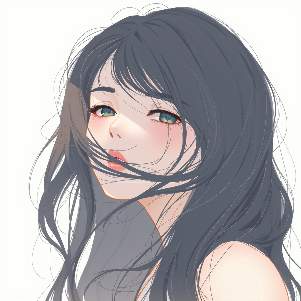 A high-resolution illustration featuring a girl with long, flowing hair partially obscuring her face, inspired by the artistic styles of Oliver Wetter and Paul Hedley. The image captures a sense of mystery with wavy hair textures, a minimalist aesthetic reminiscent of Mono-ha, and soft, harmonious colors that play with light and shadow. The composition is uniquely framed with an aspect ratio of 77:78, emphasizing the delicate balance between abstraction and realism, while a stylized touch adds an ethereal and dreamlike quality to the scene.