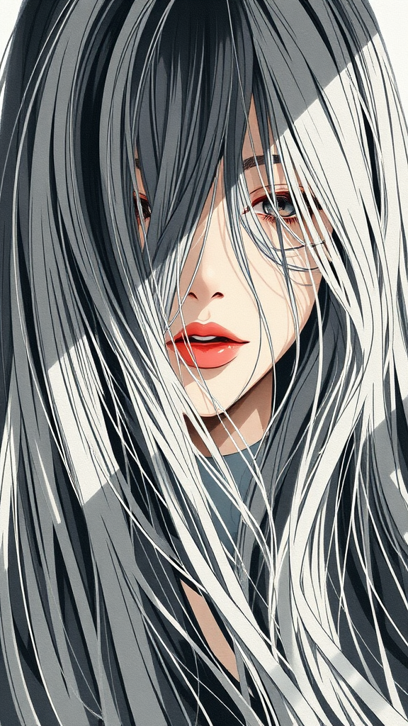 A high-resolution illustration of a girl with long, flowing hair cascading over her face, obscuring most of her features. The art style blends the fluid, dreamy qualities of Oliver Wetter and the soft elegance of Paul Hedley with a touch of the minimalist essence found in the Mono-ha movement. The composition is slightly wavy, enhancing the mysterious aura around the girl, and integrates subtle textures and shadows that bring out the delicate interplay between light and dark, adding depth and intrigue to the piece.