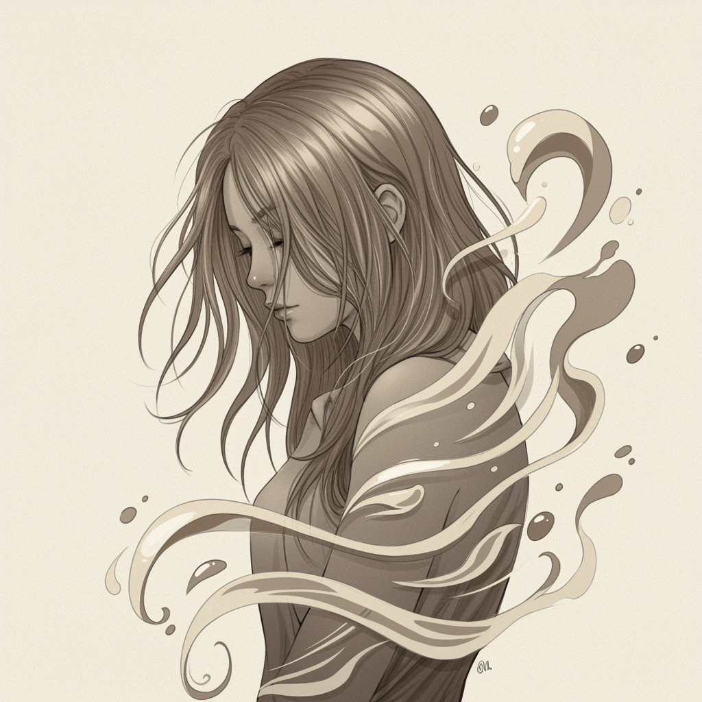 A high-resolution illustration of a girl with long, flowing hair obscuring her face, blending elements of Oliver Wetter's ethereal detailing with Paul Hedley's soft, emotive strokes. Her silhouette merges with wavy, abstract forms reminiscent of Mono-ha, suggesting a delicate balance between presence and absence. The composition's color palette is subtle, featuring muted tones that highlight the interplay between light and shadow. The girl's posture conveys a sense of introspection and mystery, capturing an aura of enigmatic grace. This artwork strikes a stylistic harmony with a touch of modern surrealism, embodying a quietly powerful aesthetic resonating within an almost dreamlike atmosphere.
