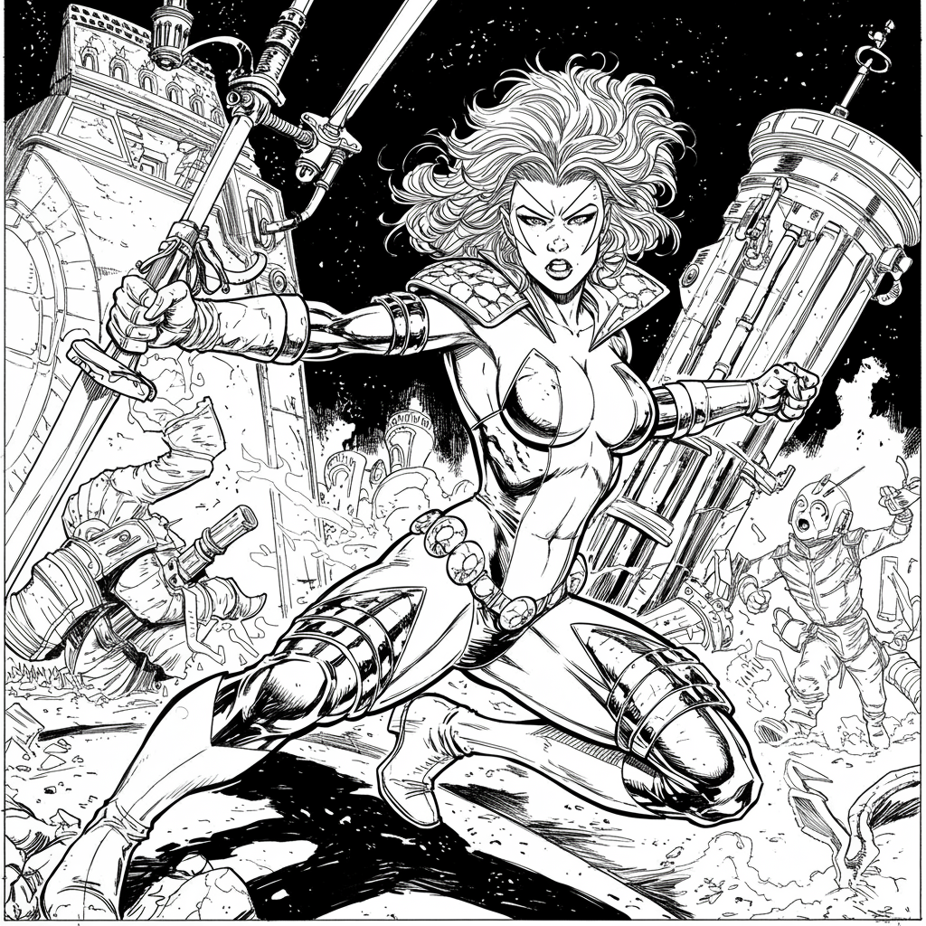 A high-resolution illustration of a powerful female character in dynamic action, reminiscent of 90s Top Cow comic style, featuring intricate inked line art with ultra-detailed costume elements. The scene captures intense lighting and dramatic shadows, emphasizing a high contrast between light and dark areas. Her dynamic pose exhibits a well-defined physique, showcasing her agility and strength as she engages in intense action. The costume is elaborately designed with meticulous details, reflecting the era's iconic style. The overall composition exudes energy and movement, embodying the high-intensity and vivid storytelling of classic comic book art.