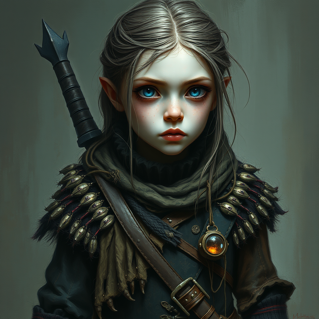 A high-resolution illustration of a young Viking warrior girl imbued with a dystopian, biomutant essence. Crafted in the style of a dark, plague-era oil painting on canvas, she wears intricately detailed clothing reflecting her mysterious origins. Rendered with soft focus and micro-detail, the artwork captures a blend of realism and fantastical elements, featuring unique textures and a moody atmosphere. In this concept, there is an abstract quality with hints of animation, bringing her to life as if she were a toy or figure in a surreal, animated world. The visual narrative evokes both intrigue and unease with peculiar, exaggerated attributes and vibrant, unnatural colors, offering an unconventional portrayal of a warrior in a disordered reality. Despite the abstract elements, her form is portrayed with an imaginative coherence that challenges traditional norms, embracing mutation and the bizarre as intrinsic elements of her character.