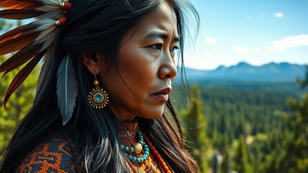 A high-resolution image captures a Kyowa Indian woman adorned in traditional jewelry featuring intricate beadwork and natural materials. She wears clothing made from woven fabrics with vibrant patterns, reflecting the earthy tones of her environment. Her long, dark hair cascades down her back, accentuated by decorative feathers. Behind her, the landscape unfolds with lush green forests and distant mountains under a clear blue sky. In her surroundings, the serene atmosphere is complemented by the gentle sounds of nature and the fresh scent of pine. Her gaze is both proud and contemplative, embodying the spirit and resilience of her heritage.