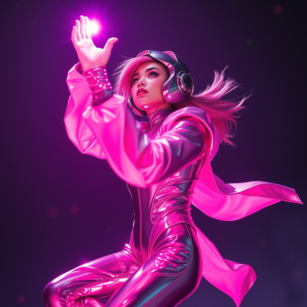 A high-resolution image captures the essence of a dynamic character in a futuristic setting. She is a shimmering AI with a human-like face and wears a sleek metal suit and a streamlined helmet. Her energetic pose is accentuated by flowing garments that suggest motion, set against a cosmic backdrop. The vivid color scheme features vibrant pinks and reflective silvers, embodying a nightcore aesthetic. Dramatic backlighting creates a neon glow that contrasts with the darker hues of the cosmos, making her shine brightly. The image achieves a depth of field and clarity, with sharp focus on the character and a blurred background. Realistic textures on her clothing and hair enhance the scene, while a visible light source in her hands produces an otherworldly gleam. The composition resembles a candid snapshot, capturing a spontaneous moment of action in a surreal, sci-fi universe. Her eyes sparkle with a deep purple hue, her entire form glowing as she reaches out for something above, in a leaping pose, eyes fixed on a point beyond. The image exudes the cinematic flair of a GoPro HERO10 Black capture, infused with the rich tones of Cinestill 800T, encapsulating the cyberpunk vibe in a cinematic scene.