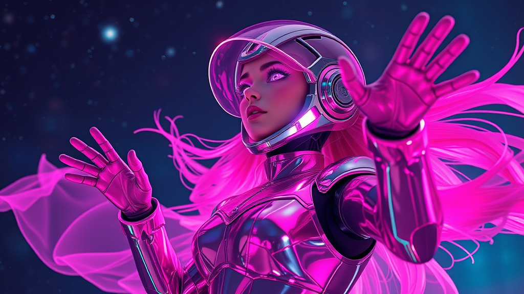 A high-resolution image captures the essence of a dynamic character in a futuristic setting. She is a shimmering AI with a face that resembles a human, donned in a sleek metal suit and helmet. The character exudes energy, with flowing garments suggesting motion. The vivid color scheme of pink and reflective silvers evokes a nightcore aesthetic, enhanced by dramatic backlighting that provides a neon glow against the darker hues of a cosmic backdrop. She is illuminated brightly, with sharp focus on her and a blurred background to mimic depth of field. Realistic textures accentuate her clothing and hair, with a visible light source in her hands creating a gleaming, otherworldly effect. The composition resembles a candid snapshot, capturing a spontaneous moment in a surreal, sci-fi universe. Her purple eyes gleam as she makes a gesture of reaching out above, leaping while gazing at something. The scene is reminiscent of a GoPro HERO10 Black shot with the feel of Cinestill 800T film, embodying a cyberpunk, cinematic atmosphere.