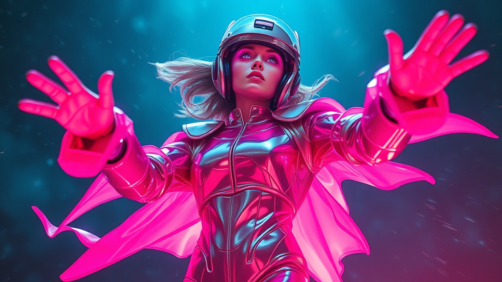 A high-resolution image captures the essence of a dynamic character in a futuristic setting. She is a shimmering AI with a human-like face, adorned in a sleek metal suit and a sophisticated helmet. Her pose is energetic, as if caught mid-leap, with flowing garments suggesting rapid motion. The vivid color scheme includes bright pinks and reflective silvers, evoking a nightcore aesthetic. Dramatic backlighting creates a neon glow, contrasting with the darker hues of a cosmic backdrop. The character appears vividly bright, with the image displaying a sharp focus on her against a softly blurred background. Her suit and hair exhibit realistic textures, and a prominent light source in her hands emits a radiant, otherworldly glow. Her eyes, a striking purple, are fixed upwards as she reaches for something beyond. The composition resembles a candid snapshot, capturing a spontaneous moment of action in a surreal, sci-fi universe. Inspired by the GoPro HERO10 Black and Cinestill 800T, it features a cyberpunk, cinematic scene that conveys both clarity and depth.